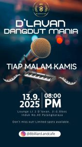 Bagi pecinta musik dangdut yang ingin menikmati suasana berbeda, kini hadir Dangdut VIP Lounge, sebuah tempat hiburan bernyanyi dengan konsep modern dan elegan, namun tetap ramah di kantong. Hadir sebagai destinasi baru untuk bersantai bersama sahabat, keluarga, maupun rekan kerja, tempat ini siap memanjakan pengunjung dengan suasana mewah tanpa harus merogoh kocek terlalu dalam, Hiburan Dangdut Mania tiap Malam ,Kamis dan Mulai pukul 20.00 Wib sampai  11.00 Wib.