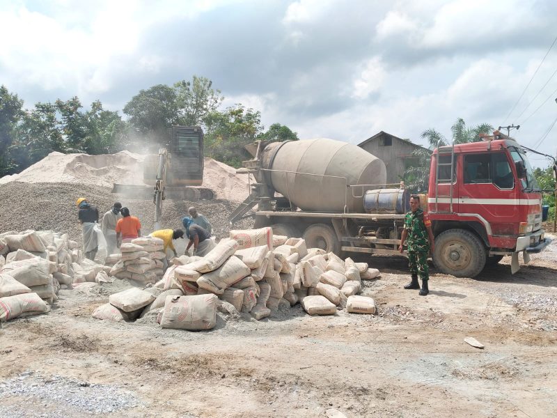 LINTAS KALIMANTAN | Babinsa Koramil 1014-05/Pangkalan Banteng, Serda Untung Irawan, memantau langsung kegiatan semenisasi jalan di Desa Lada Mandala Jaya, Kecamatan Pangkalan Lada, Selasa (14/10/2025) pagi.