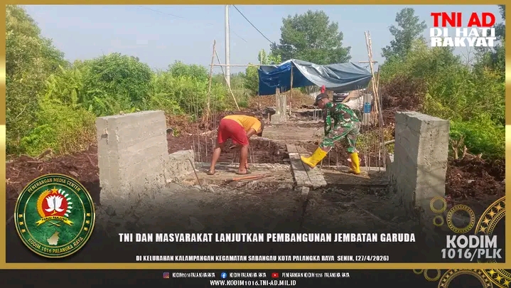 LINTAS KALIMANTAN | PALANGKA RAYA – Semangat kemanunggalan TNI bersama rakyat kembali ditunjukkan melalui aksi gotong royong dalam pembangunan Jembatan Garuda di Kelurahan Kalampangan, Kecamatan Sabangau, Kota Palangka Raya, Senin (27/4/2026). Kegiatan yang melibatkan personel TNI dari jajaran Kodim 1016/Palangka Raya bersama masyarakat setempat itu menjadi gambaran nyata sinergi antara aparat teritorial dan warga dalam mendukung pembangunan infrastruktur yang bermanfaat langsung bagi masyarakat.