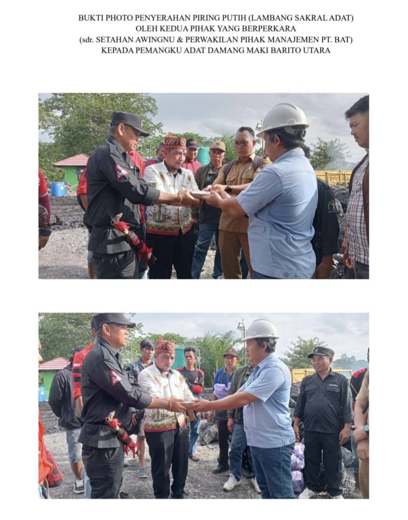 Dimana yang sebelumnya pihak managemen PT BAT telah menyepakati untuk menghentikan sementara seluruh aktivitas operasional jetty hingga tercapai penyelesaian dengan pemilik lahan. Kesepakatan itu disaksikan langsung oleh berbagai pihak, termasuk ormas Dayak yang turut mengawal jalannya proses adat sehingga dilakukan penyerahan sebuah piring putih.