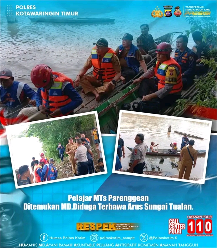 LINTAS KALIMANTAN |✓SAMPIT – Seorang pelajar laki-laki berinisial AS (15), yang masih duduk di bangku kelas IX Madrasah Tsanawiyah (MTs) di Kecamatan Parenggean, Kabupaten Kotawaringin Timur (Kotim), ditemukan meninggal dunia setelah diduga terseret arus Sungai Tualan, Senin (27/4/2026).