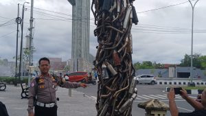 Palangka Raya – Inovatif dan penuh makna, jajaran Satuan Lalu Lintas (Satlantas) Polresta Palangka Raya menyulap ratusan knalpot brong hasil sitaan menjadi sebuah monumen unik yang kini berdiri megah di depan Pos Polisi Lalu Lintas Bundaran Besar Jalan Yos Sudarso, Kota Palangka Raya.