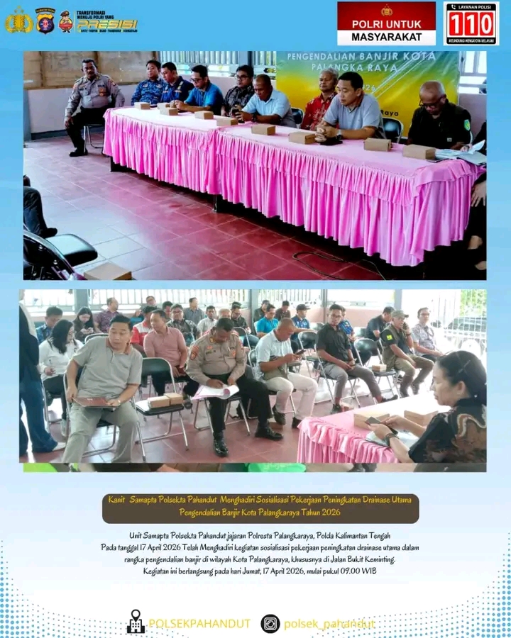 LINTAS KALIMANTAN | PALANGKARAYA – Jajaran Unit Samapta Polsek Pahandut, Polresta Palangkaraya, Polda Kalimantan Tengah, menunjukkan komitmennya dalam mendukung program pembangunan dan penanganan banjir di wilayah ibu kota provinsi dengan menghadiri kegiatan sosialisasi pekerjaan peningkatan drainase utama pengendalian banjir Kota Palangkaraya Tahun 2026.