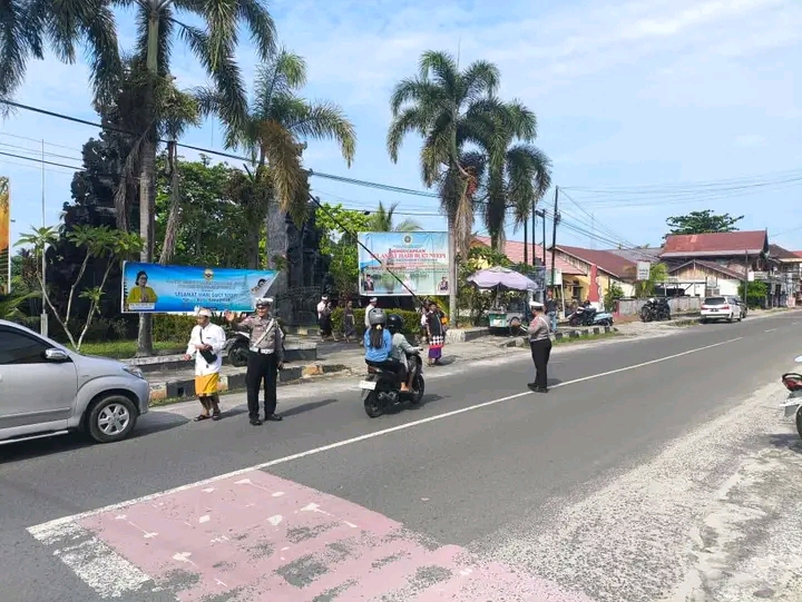 Kegiatan yang dimulai sejak pukul 06.30 WIB tersebut dilaksanakan oleh personel Satlantas, yakni BRIPKA Tommy Lomban dan BRIGPOL Reysem Gerung. Pengamanan difokuskan di sekitar Pura Pitamaha, Jalan Kinibalu, guna memastikan aktivitas ibadah umat Hindu berlangsung dengan aman dan khidmat.