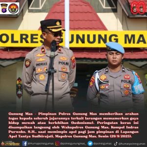 Gunung Mas – Kepolisian Resor (Polres) Gunung Mas menegaskan larangan keras bagi seluruh personel untuk tidak memamerkan gaya hidup mewah maupun berlebihan (hedonisme). Arahan tersebut disampaikan langsung oleh Wakapolres Gunung Mas, Kompol Indras Purwoko, S.H., saat memimpin apel jam pimpinan di Lapangan Apel Tantya Sudhirajati, Mapolres Gunung Mas, Senin (29/9/2025).